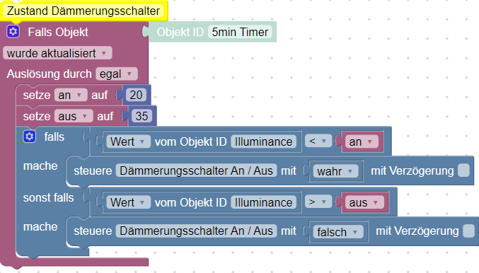 Wenn ja und gleichzeitig der Wert vom Dämmerungsschalter geben ist soll die Beleuchtung an gehen.