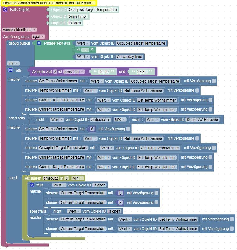 Quelltext anzeigenLinks hierherNach oben Teilen per Teilen per... Twitter Facebook Telegram WhatsAppLetzte ÄnderungenPer E-Mail sendenDruckenPermalink × Heizung Steuerung für das Wohnzimmer Steuerung der zwei Heizkörper im Wohnzimmer - Thermostat, Zeit, Tür und Receiver Zurück. Zurück.